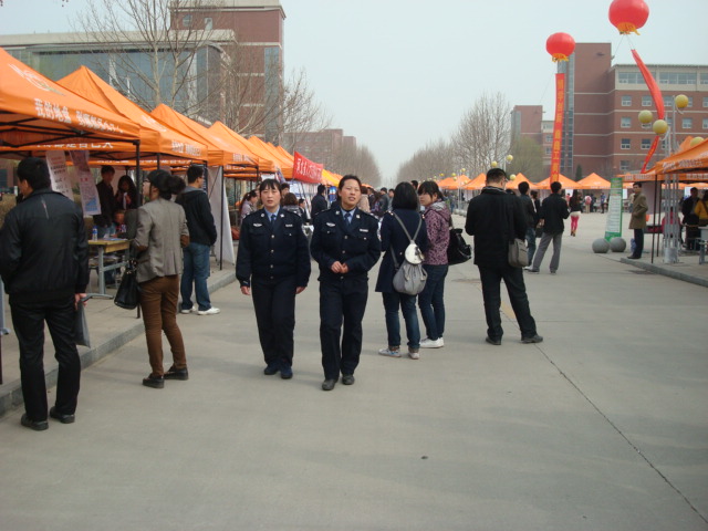 为确保“双选会”的安全、顺利进行,3月26日起,我办主要从以下三个方面加强了工作:一是与工商学院领导进行了详细沟通,制定了“双选会”期间的安保工作预案;二是协调国保、派出所等辖区有关公安执法部门干警于“双选会”当日到现场进行巡逻执法;三是提前通知,设置路障,实现至诚道禁行机动车。