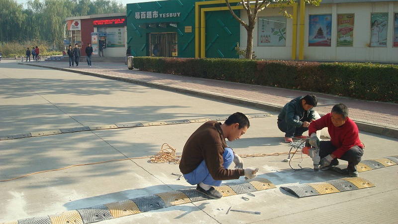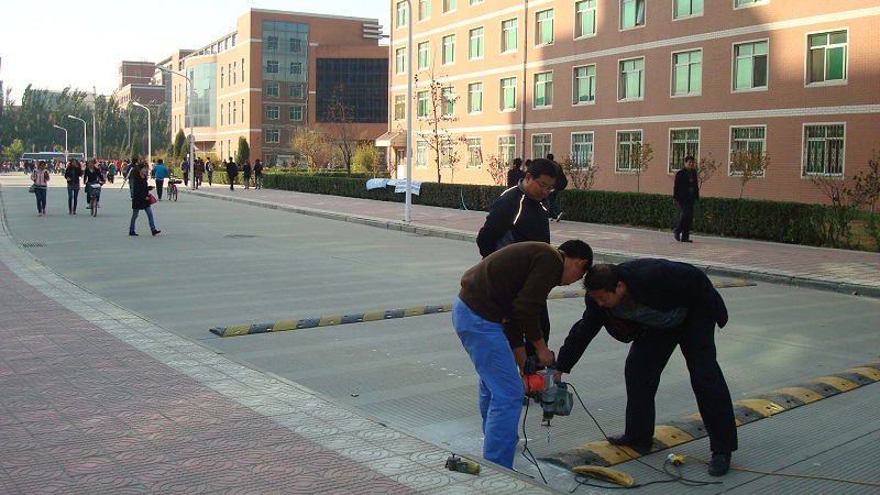 为迎接党的十八胜利召开,构建平安和谐校园,我办于10月31日购置了一批机动车辆通行减速带,并于当天全部安装在坤舆生活园区重点路段。